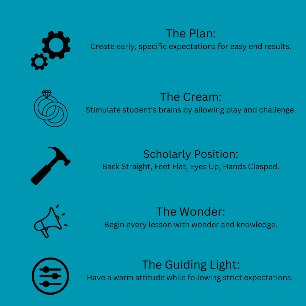 Discipline is my favorite of the principles of classroom culture. It takes knowledge and determination to get thirty students to hold themselves accountable. Many students (ages 8+, not subjected to students with IEP/504 plans) have a basic understanding of the latter, while the former is delegated by the teacher. When asking for something unseen in a classroom, it is important to use specific language that relates to the task at hand. For example, using the words ‘scholarly position’ will get the students to sit straighter, interlace their fingers on the desk, and have their feet flat on the floor. Without the teacher teaching the habits of a scholarly position, the students will not be aware of exact expectations.