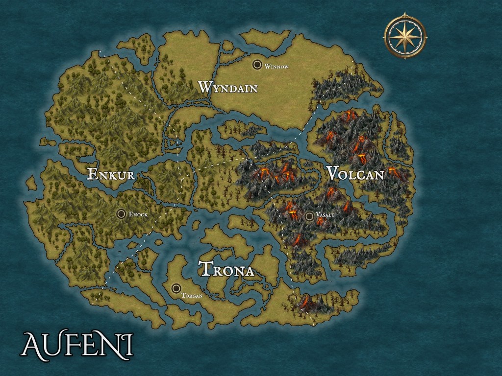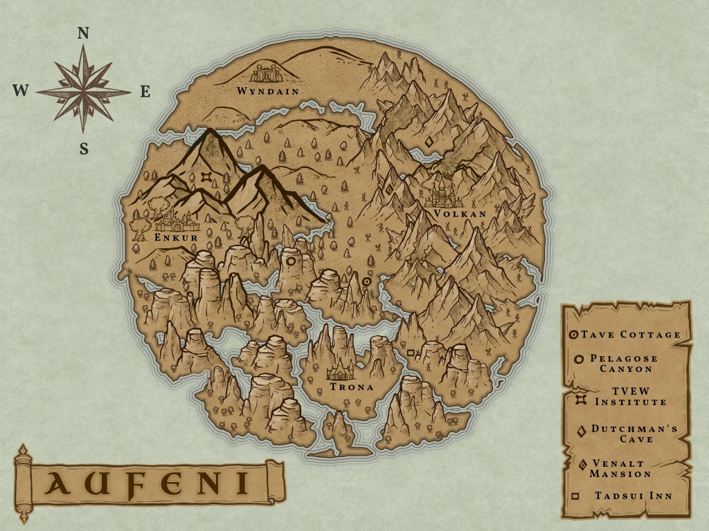 My first map had no text because I had no yet thought of Aufeni…which if you are curious is derived from AU (gold), FE (Iron), and NI (Nickel) which are included in the center of the Earth’s main components.