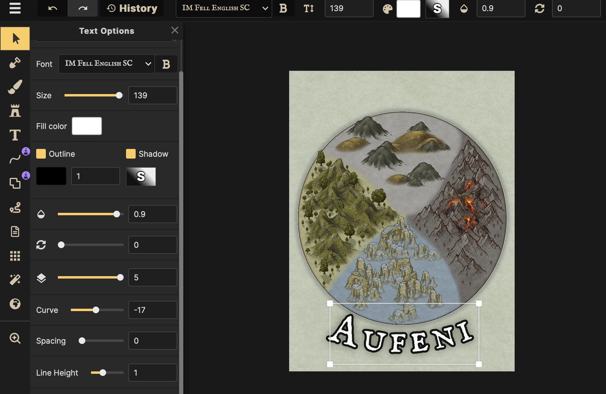 The T button will lead you to the Text Options. The settings control the creation of the font, size, shape, color, shadow, outline, spacing, height, and curve for your letters. Text is important for a fantasy map! You need the title of your book and locations (if you plan on including those) prior to adding text.